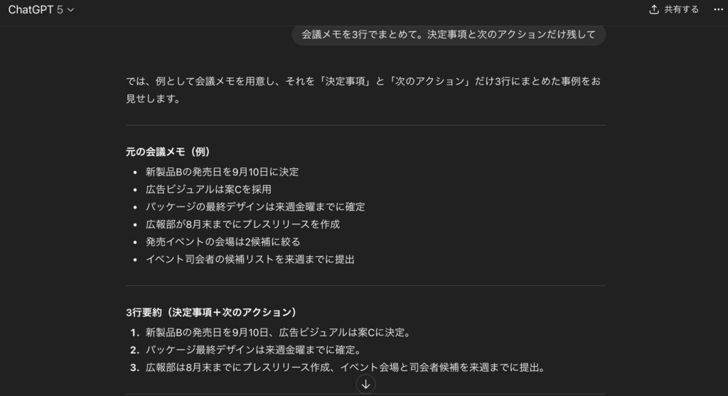 • 指示文サンプル 「この会議メモを3行でまとめて。決定事項と次のアクションだけ残して」