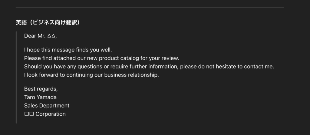 • 指示文サンプル 「この日本語のメールを、丁寧で自然なビジネス英語に翻訳して」
