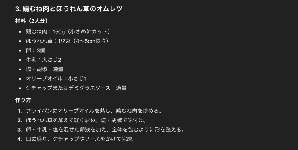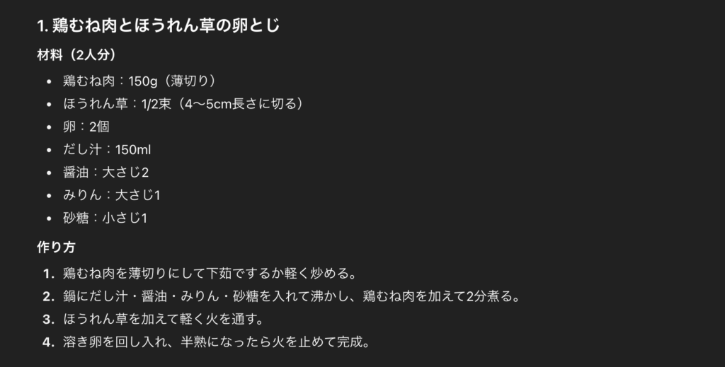 • 指示文サンプル 「鶏むね肉、ほうれん草、卵で作れる晩ごはんレシピを3つ提案して。所要時間も書いて」