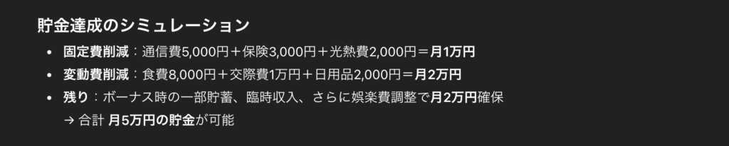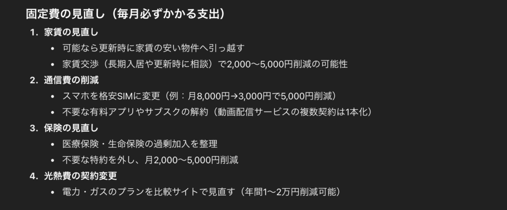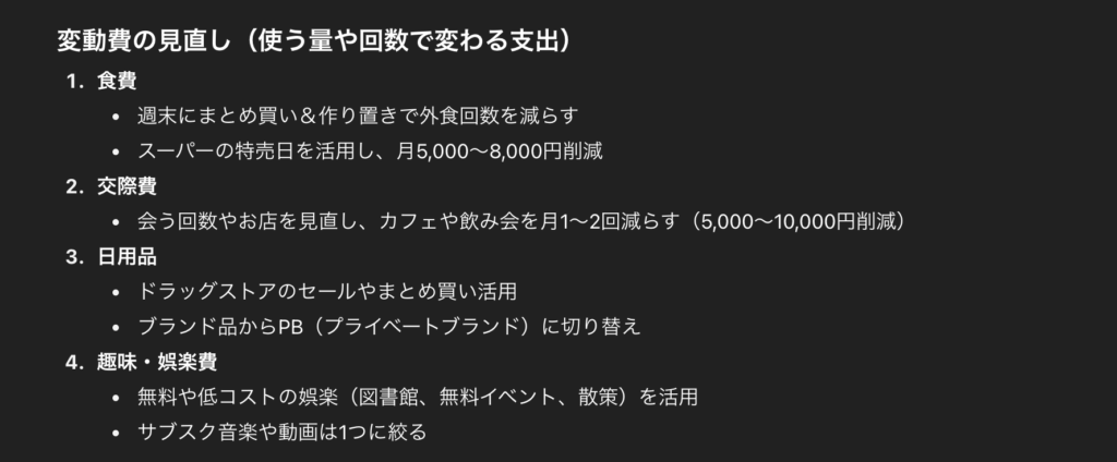 • 指示文サンプル 「月5万円貯金するための節約方法を考えて。固定費と変動費の見直し案も含めて」
