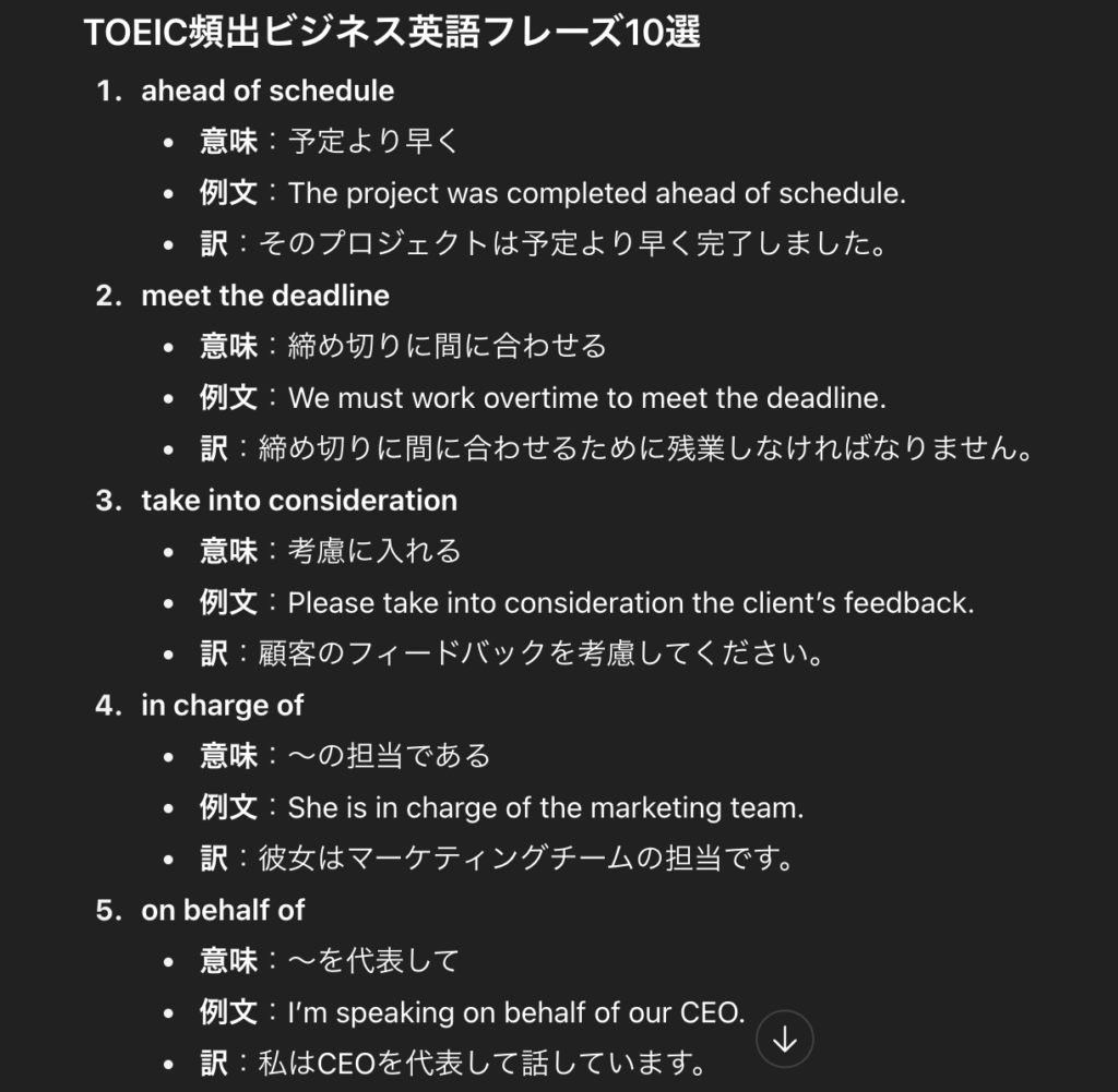 TOEIC対策として、よく出るビジネス英語フレーズと例文を提案してもらう。