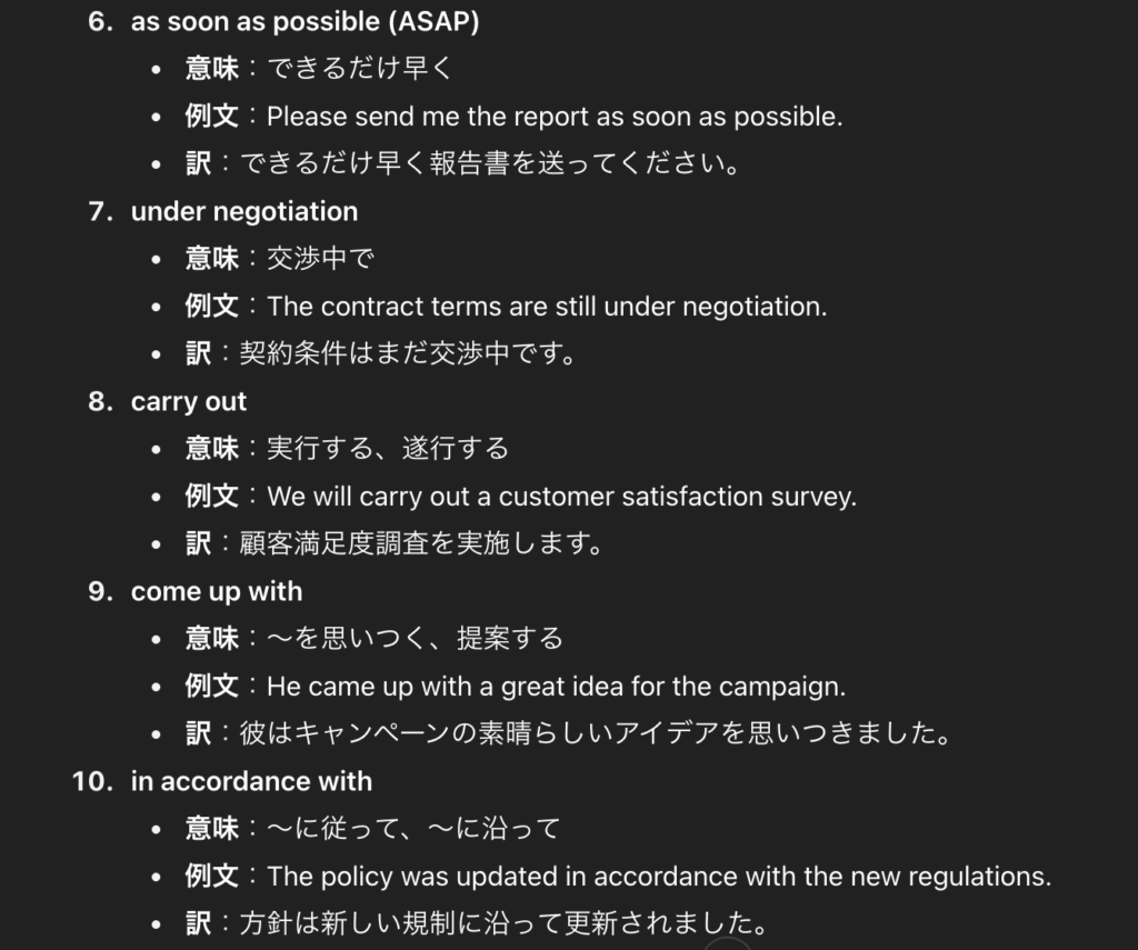 • 指示文サンプル 「TOEICでよく出るビジネス英語フレーズを10個、日本語訳と例文付きで教えて」