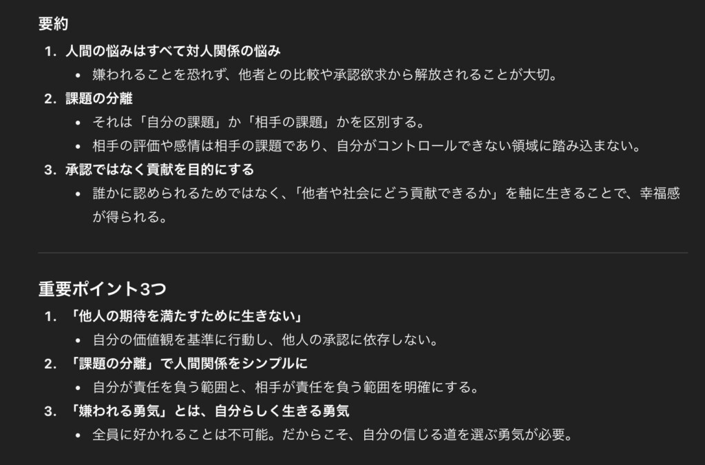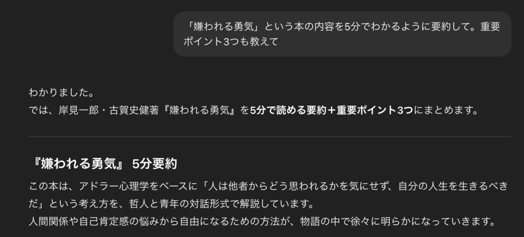 • 指示文サンプル 「○○という本の内容を5分でわかるように要約して。重要ポイント3つも教えて」