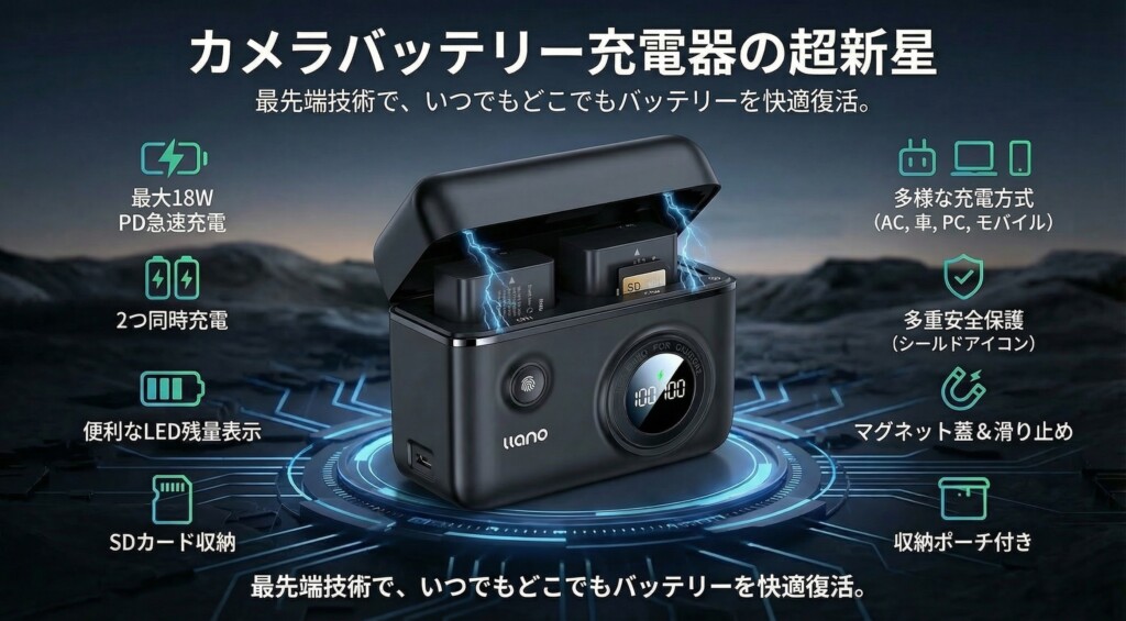 こちらのバッテリーケースはNP-FZ100を2個同時に充電できて、USB-C給電、残量も数字で確認できるタイプです。充電もできてSDカード収納もできるバッテリーケースでおすすめです。
