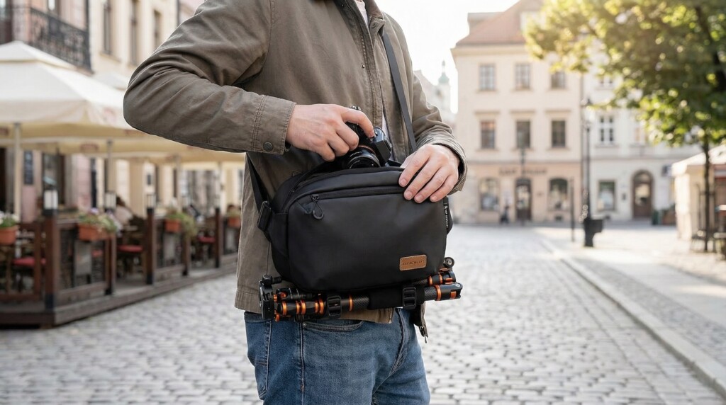 K&F Conceptのカメラショルダーバッグは、軽さと収納力を両立したシンプルなカメラバッグです。約220gと軽量ながら、カメラ本体1台と交換レンズ2本を収納でき、日常使いから旅行、アウトドアまで幅広く対応します。