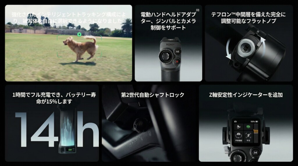 また、電源を切れば自動でジンバルが折り畳まれてロックされ、電源を入れればパッと撮影状態に戻る第2世代の自動軸ロック機能も、移動が多い現場では本当に重宝しますね。移動のたびにパズルのように軸を固定する手間がなくなるのは、 一人で撮影するような現場にとっては大きなメリットです。