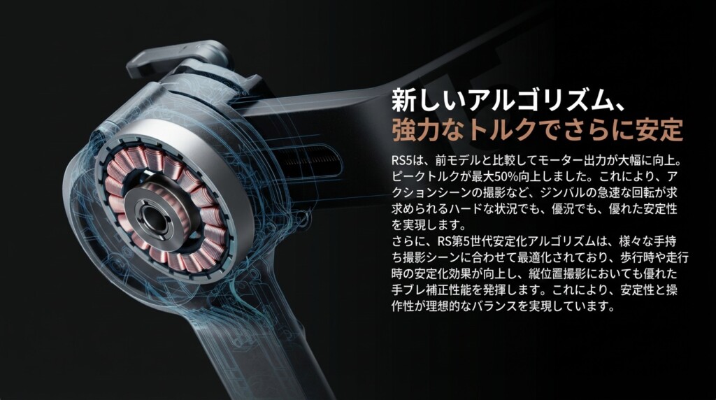 RS 5は従来モデルと比べて、モーターの最大トルクがなんと50%も向上しました。これにより、急なパンやチルト、素早い方向転換が必要なシーンでも、これまで以上に力強く安定した制御ができるようになっています。さらに最新の第5世代安定化アルゴリズムを搭載しているので、速い足取りでの撮影や、今流行りの縦向き撮影でも、より滑らかな映像を撮ることができます。