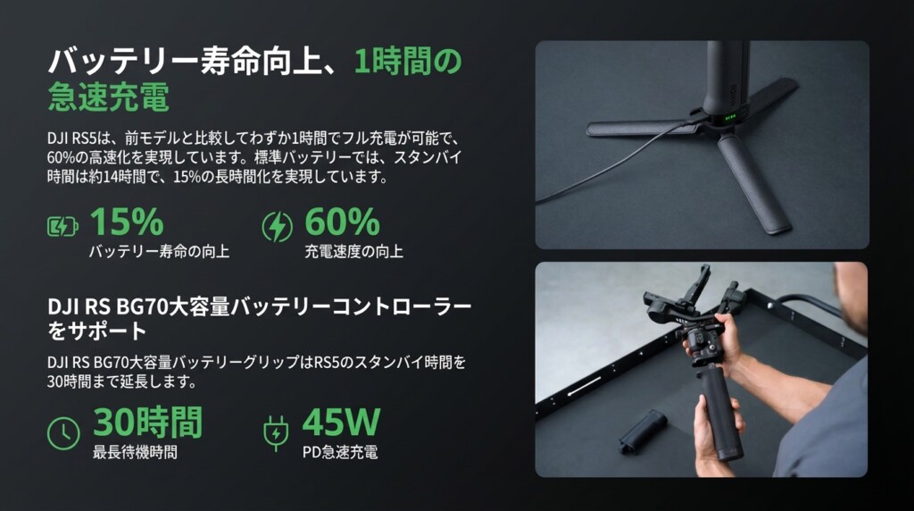バッテリーの使い勝手も良くなっています。フル充電までにかかる時間は約1時間と、以前よりも60パーセントも速くなりました。標準のバッテリーでも約14時間撮影を続けられますが、もっと長時間撮影したいときは別売りのBG70大容量バッテリーグリップを使えば、最大30時間という驚異的な駆動時間を実現できます。これなら丸一日のハードな撮影でも、バッテリー切れを心配せずに集中できそうです。