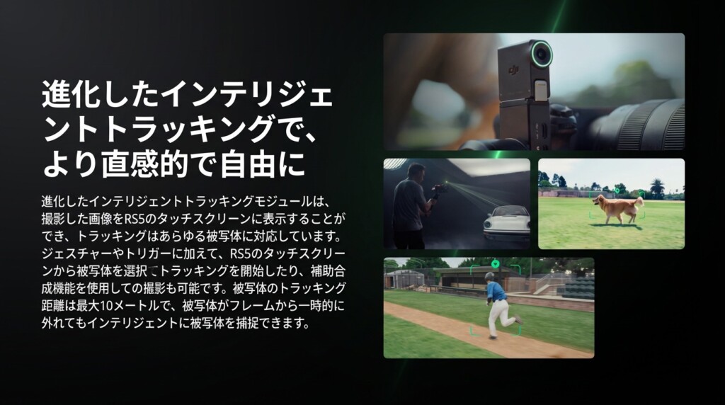 このシステムは人間だけでなく、車やペットの犬、猫なども認識してくれる優れものです。さらに、最大10メートル離れていても追跡できますし、もし被写体が一時的に柱の陰などに隠れてフレームから外れても、また現れた時に素早く再認識してくれるので、動きの激しい現場でも安心感があります。