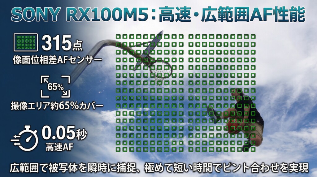 RX100M5の最大の特徴は、RX100シリーズで初めて採用された像面位相差AFセンサーです。撮像エリアの約65%をカバーする315点のAFポイントが配置されており、画面の広い範囲で被写体を瞬時に捉えることができます。これにより、0.05秒という極めて短い時間でピントを合わせることが可能になりました。