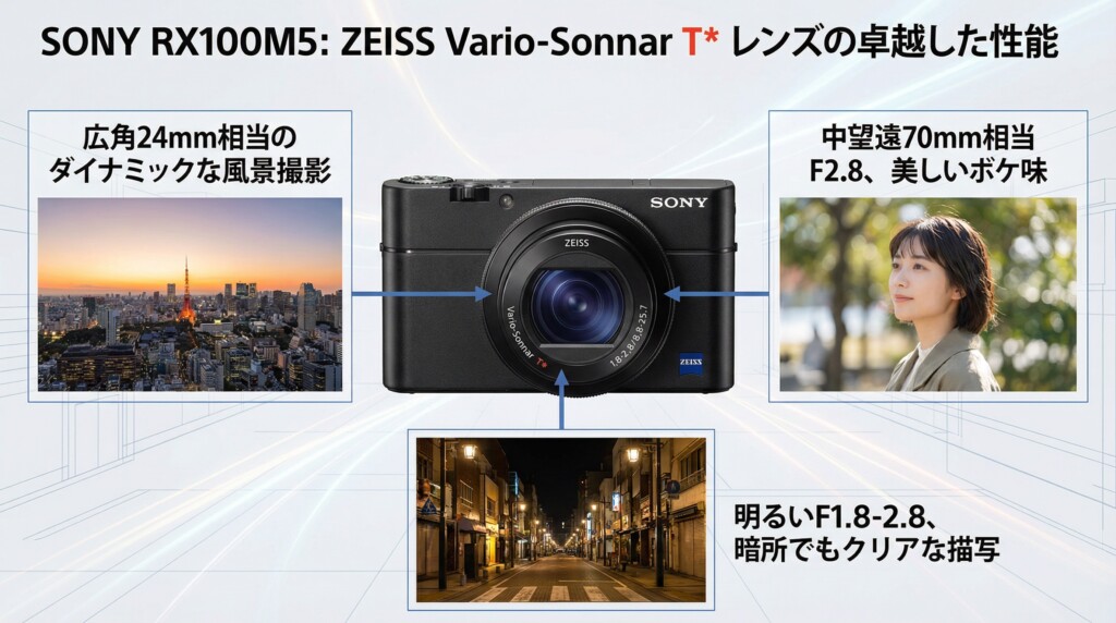 レンズには、広角24mmから中望遠70mm相当(35mm判換算)をカバーするZEISS Vario-Sonnar T*レンズが採用されています。広角端でF1.8、望遠端でもF2.8という明るさを維持しており、背景を美しくぼかしたポートレート撮影や、光量の少ない室内や夜景での撮影でもノイズを抑えたクリアな画像が得られます。