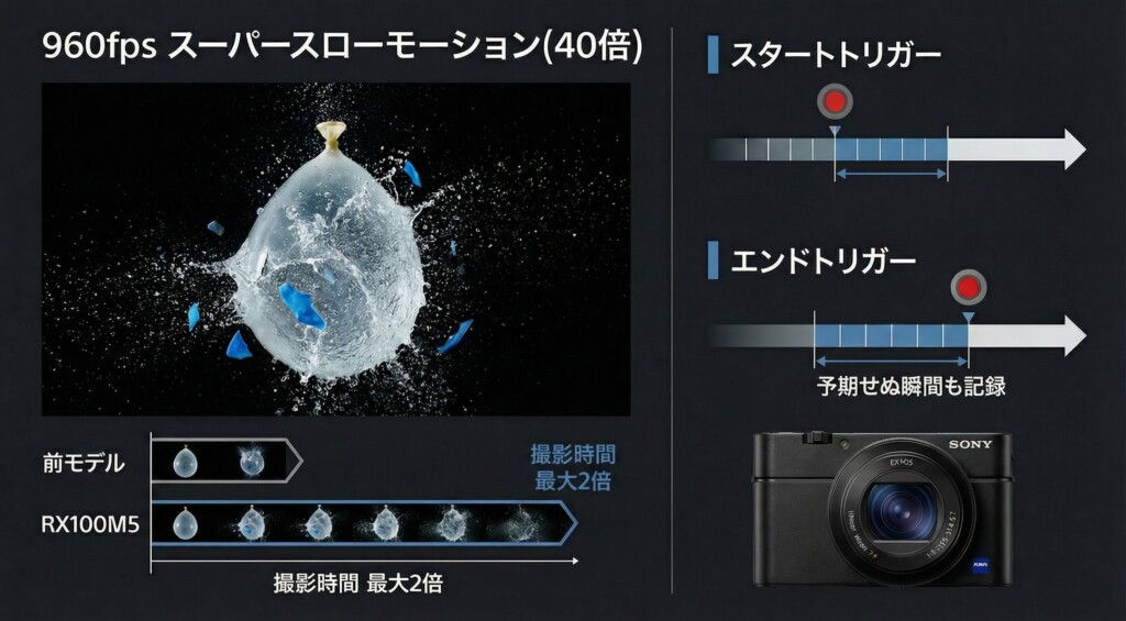 最大960fps(40倍)のスーパースローモーション撮影機能は、前モデルから撮影持続時間が最大2倍に延長されました。肉眼では捉えきれない高速なアクションを、映画のような印象的な映像として残すことができます。撮影モードは、ボタンを押した瞬間から記録する「スタートトリガー」に加え、ボタンを押した直前の数秒間を記録する「エンドトリガー」も選択でき、予期せぬ瞬間の撮影にも対応可能です。