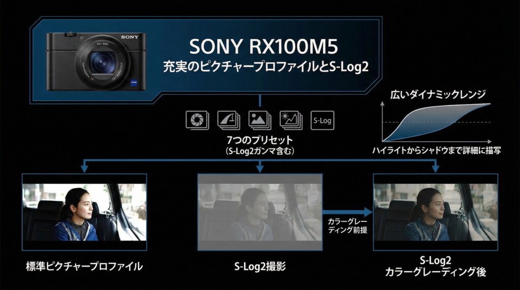 プロ用ビデオカメラに搭載されている「ピクチャープロファイル」機能が利用可能です。S-Log2ガンマを含む7つのプリセットが用意されており、撮影後のカラーグレーディングを前提とした広いダイナミックレンジでの撮影が可能です。これにより、ハイライトからシャドウまで詳細に描写された本格的な映像制作が行えます。