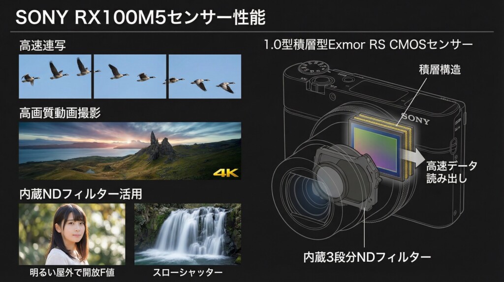 心臓部には、有効約2010万画素の1.0型積層型Exmor RS CMOSセンサーが搭載されています。この積層構造により、従来のセンサーよりも大幅に高速なデータ読み出しが可能となり、高速連写や高画質な動画撮影を支えています。また、内蔵の3段分NDフィルターを使用することで、明るい屋外でも開放F値での撮影やスローシャッターを楽しむことができます。