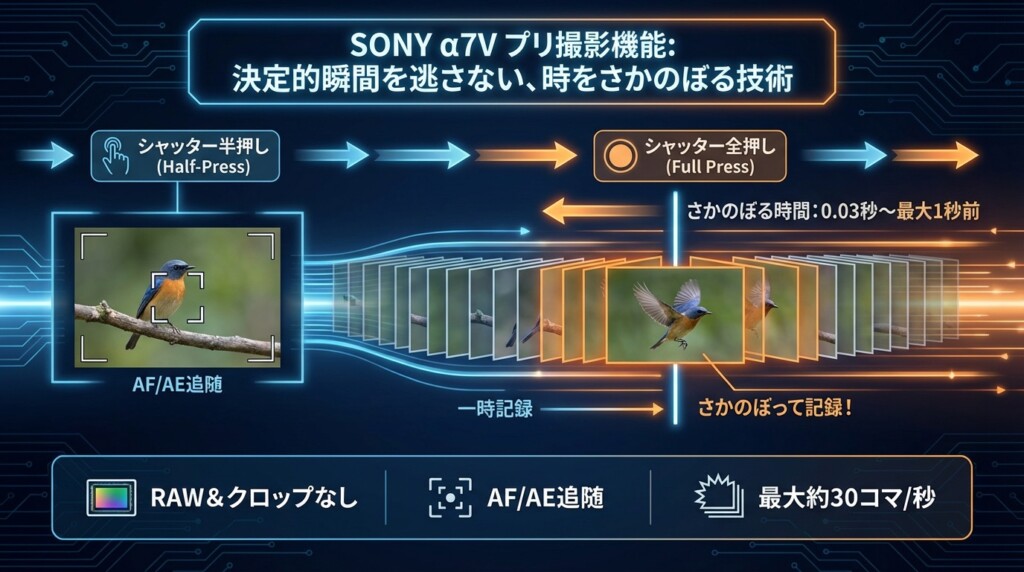 α7IVと同じ有効約3300万画素ながら、センサー読み出し速度はα7IV比で約4.5倍とされ、ダイナミックレンジも最大約16ストップに進化。 - 30コマ/秒連写+プリ撮影+AI被写体認識AF